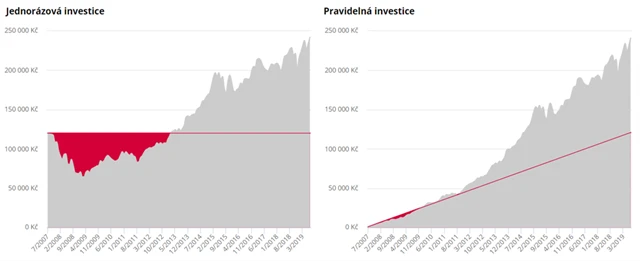 Pravidelná investice byla i v případě zahájení nákupů rok až dva před krizí ve ztrátě jen zhruba rok, a to v méně výrazné. Velká část nákupů ale již neproběhla v době, kdy byly akcie levnější (při krizi), což se projevilo na celkovém výnosu.