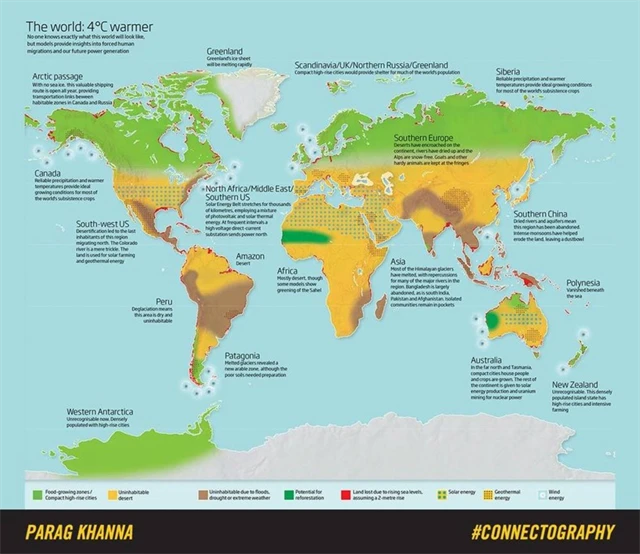 Tuto robustní platformu ve stále rozkolísanějším světě navíc doplňuje "klimatická dividenda". Postupné oteplování mění nehostinný sever na místo s kvalitní zemědělskou půdou a rozumnými podmínkami k životu. Kanada se tak podle kvalifikovaných odhadů stane společně s Ruskem farmářem zásobujícím (a často i zachraňujícím) svět. A díky tomu se navíc její již tak bohatá surovinová a energetická základna výrazně navýší. To vše v rámci rozumné environmentální politiky, která má navzdory jistým úletům směrem k oběma pomyslným extrémům v Kanadě tradici.