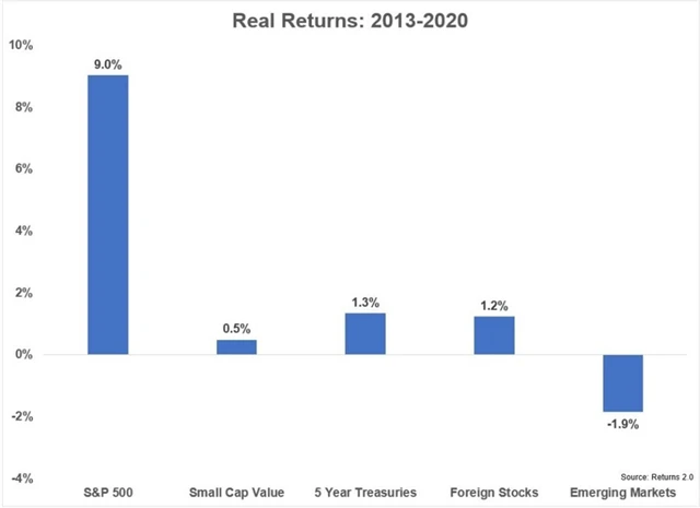 Americký akciový index S&P 500 mezi roky 2013 a 2020 přidal v průměru po očištění o inflaci 9 % ročně. Například 5leté americké vládní dluhopisy investorům naproti tomu vynášely jen 1,3 % a zahraniční akcie 1,2 %. Akcie na rozvíjejících se trzích dokonce po očištění o inflaci v průměru o 1,9 % ročně oslabily. Investoři s diverzifikovanými portfolii si musejí trhat vlasy. Podobně, jen ne s tak výraznými rozdíly, vychází i srovnání výkonnosti jednotlivých aktiv mezi roky 1994 a 1999.