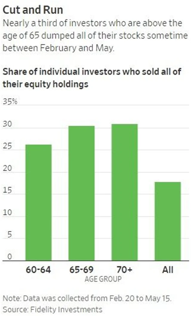 Ti, kteří prodali akcie na poblíž březnového tržního dna, jsou na tom nyní mnohem hůře než ti, kteří nad tím uvažují dnes, v každém případě jde však o poměrně náročné rozhodování. Ještě složitější je to pro investory, kteří jsou těsně před důchodem a nemají mnoho času na to, aby případné další ztráty vyřešil dlouhý investiční horizont. Podle Fidelity téměř třetina investorů v USA starších 65 let mezi únorem a květnem prodala všechny akcie, celkově to udělalo 18 % investorů.