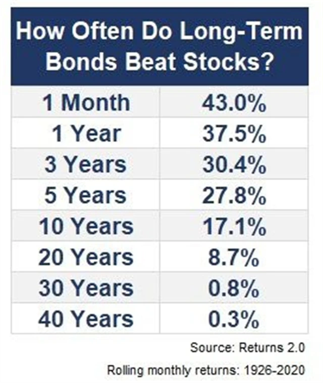 Akcie jsou v dlouhodobém horizontu považovány za výnosnější než dluhopisy, takže závěry NYT vyznívaly poněkud překvapivě. Carlson však přiznává, že ani toto "pravidlo" v minulosti vždy neplatilo. Při pohledu na tabulku níže je ale jasné, že čím delší je investiční horizont, tím menší je pravděpodobnost, že dluhopisy budou výnosnější než akcie.