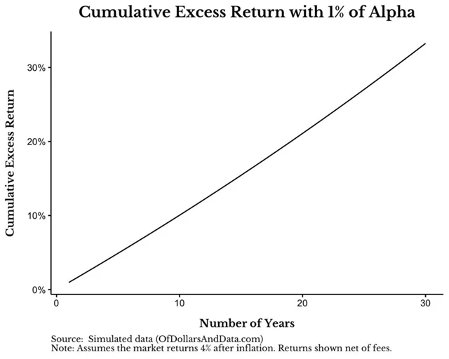 Rozhoduje samozřejmě jakýkoli náskok. Pokud by portfoliomanažer spravující aktiva v hodnotě 10 miliard dolarů dosáhl za rok výnosu vyššího o 0,01 procentního bodu, činila by jeho alfa (nadvýkonnost) reálně milion dolarů. Investoři ovšem musejí uvažovat realisticky a přiznat si, jak dlouho jsou schopní určité nadvýkonnosti dosahovat.