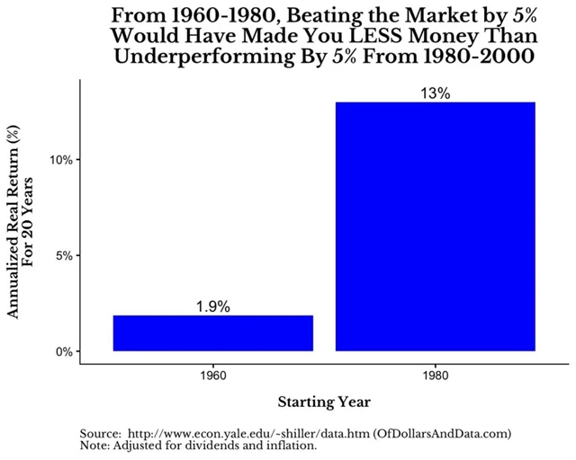 Samotná alfa navíc neznamená vše. Pokud budeme výnosy srovnávat s dlouhodobou výkonností trhu, bude klíčové, o jaké půjde období. Pokud by například investor mezi roky 1960 a 1980 porážel každý rok trh o pět procentních bodů, vydělal by paradoxně méně, než kdyby za trhem mezi roky 1980 a 2000 o pět procentních bodů každý rok zaostal.