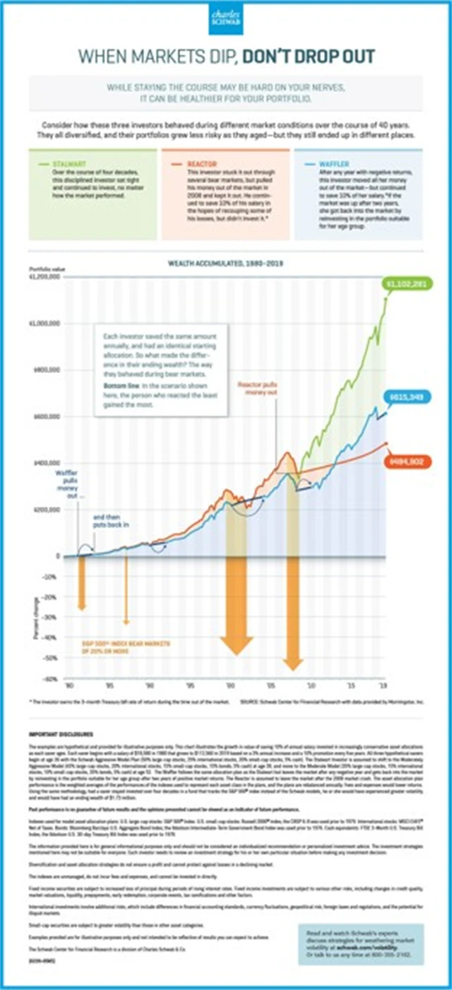 Přiložená grafika srovnává vývoj tržní hodnoty portfolií tří hypotetických investorů. Všichni tři na trh vstoupili v 26 letech, začali investovat podle stejné strategie (50 % americké large cap akcie, 25 % světové akcie, 20 % americké small cap akcie, 5 % hotovost) a z platu si na investice odkládali stejné částky (ročně 10 % platu, který se postupně zvyšoval z 18 580 USD v roce 1980 až na 112 560 USD v roce 2019).