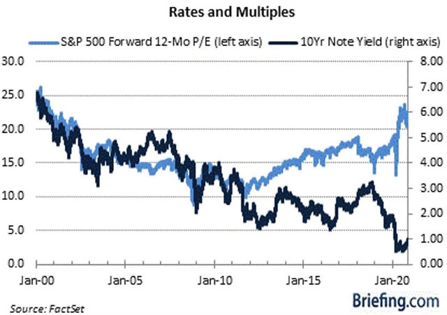 S tou otázkou vás posílá Jeremy Grantham, že ano?! Ne, bublina to není. Ocenění akcií vzhledem z ziskům a tržbám je opravdu vysoké, to ano, ale je potřeba vnímat, jak nízké jsou úrokové sazby. Před dvaceti lety trh začal padat z forwardového P/E 26, ale výnos 10letých vládních bondů USA byl přes 6 %. V současnosti je stále pod procentem a forwardové P/E je "jen" okolo 22.
