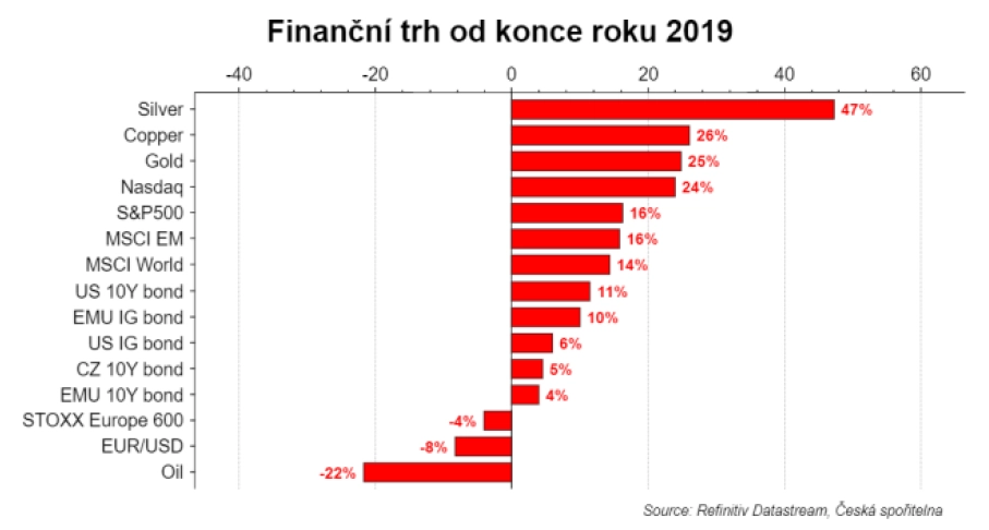 Druhý graf ukazuje zhodnocení aktiv od konce roku 2019. Lze jej chápat vlastně jako výkonnost aktiv v portfoliu pasivního investora, který neprodával v době koronavirové paniky, držel pozice a nesnažil se časovat trh. Například zhodnocení indexu S&P 500 je citelně nižší, ale je stále vysoce nadprůměrné.