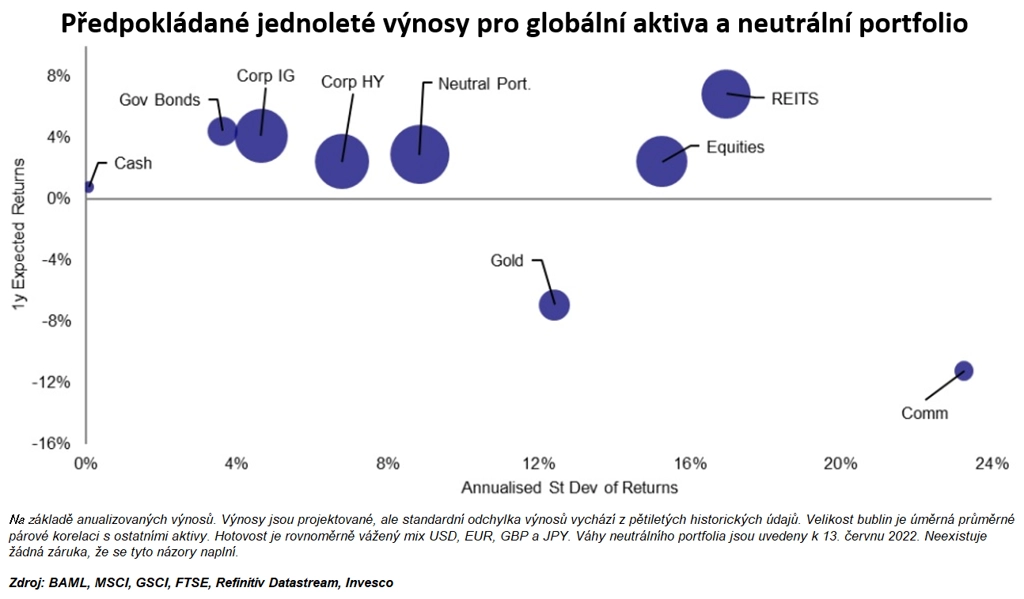 Hlavní centrální banky zpřísňují měnovou politiku, výnosy dluhopisů rostou a ceny většiny aktiv klesají. Vzhledem k tomu, že výnosy amerických vládních bondů jsou na nejvyšší úrovni za více než deset let a riziko recese na globální úrovni roste, je čas rebalancovat portfolia, a to včetně navýšení váhy kvalitních dluhopisů. Jiný podíl by měly mít také nemovitosti, a to na úkor nižší váhy akcií (ty jsou podvážené), dluhopisů investičního stupně (nadále nadvážené), vysokovýnosových bondů (vyřadit z portfolií) a hotovosti (nadále nadvážena). V rámci regionů upřednostňujeme aktiva ve Spojeném království a na rozvíjejících se trzích.