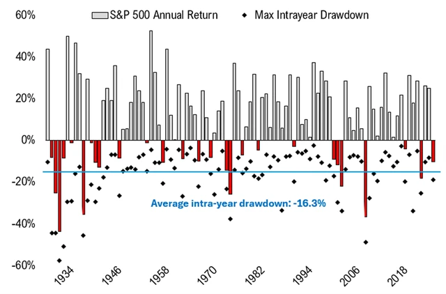 Ano, akciový trh někdy klesá. Můj oblíbenec Ben Carlson ze společnosti Ritholtz Wealth Management se probral statistikami a zjistil, že americký index S&P 500 v průměru několikrát ročně odepíše 5 %, co pár let koriguje alespoň o desetinu a jednou za čtyři až pět let spadne o 20 % a více (letos se tomu na bázi závěrečných denních kurzů těsně vyhnul, intradenně ale odepisoval i přes 21 %). V průměru během kalendářního roku index od roku 1928 odepsal přes 16 %.