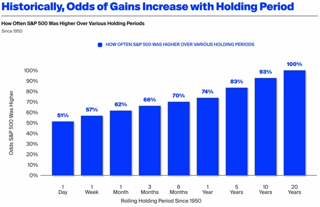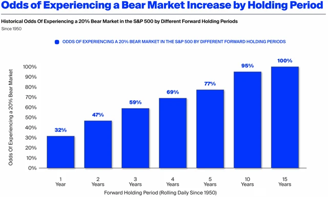 "Volatilita není chybou investování, je jeho neoddělitelnou součástí a zásadní hybnou silou trhů. Čím déle na trhu vydržíte, tím lépe na tom pravděpodobně budete, i když také platí, že tím větší je pravděpodobnost, že zažijete nepříjemné časy. Přežít jakékoli tržní počasí je jednou z nejdůležitějších dovedností úspěšného investora," říká Ben Carlson z investiční společnosti Ritholtz Wealth Management.