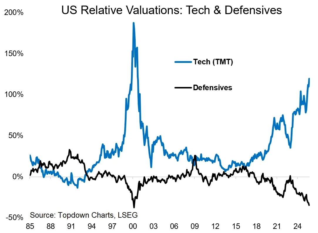 Rozdíl v relativní hodnotě mezi technologickými a defenzivními tituly je dokonce největší od roku 2000. Jinými slovy, největší sektor v indexu je zároveň nejdražší, ten s nejmenší váhou je naopak nejlevnější.