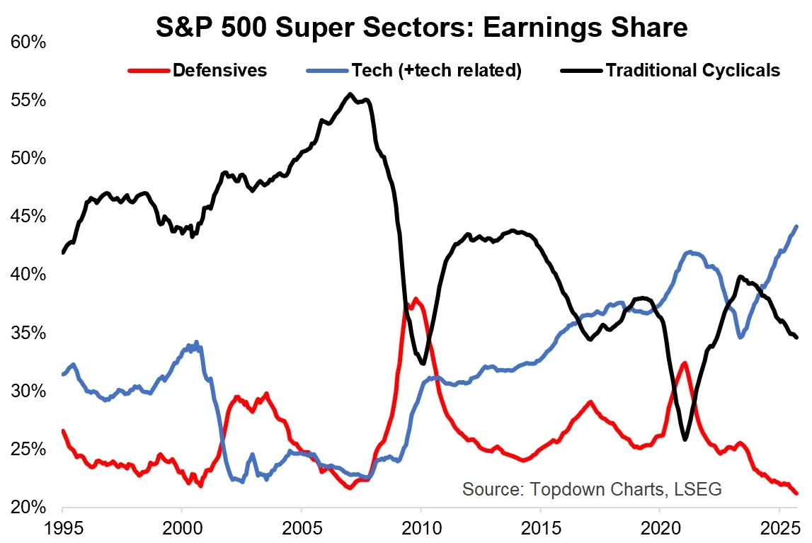 V současnosti mají fondy sledující index S&P 500 rekordně vysokou expozici vůči technologickému sektoru a historicky nízký podíl defenzivních odvětví, jako jsou zdravotní péče, veřejné služby (utility) nebo potravinářství. Pro období růstu je to ideální mix, ale pokud by se cyklus otočil, půjde o nebezpečně koncentrovanou sázku v opačném směru.