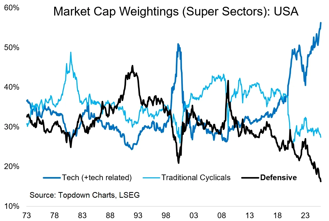 V současnosti je americký akciový trh silně koncentrovaný v technologickém odvětví a firmách navázaných na téma umělé inteligence. V minulosti k podobně silné koncentraci okolo jednoho sektoru nebo tématu docházelo právě v klíčových momentech tržního cyklu. Když indexy silně tíhly k defenzivě, následoval zpravidla obrat vzhůru. Když naopak převažovaly technologie a cyklické tituly, jako jen tomu nyní, mnohdy šlo o signál blížícího se vrcholu indexu.