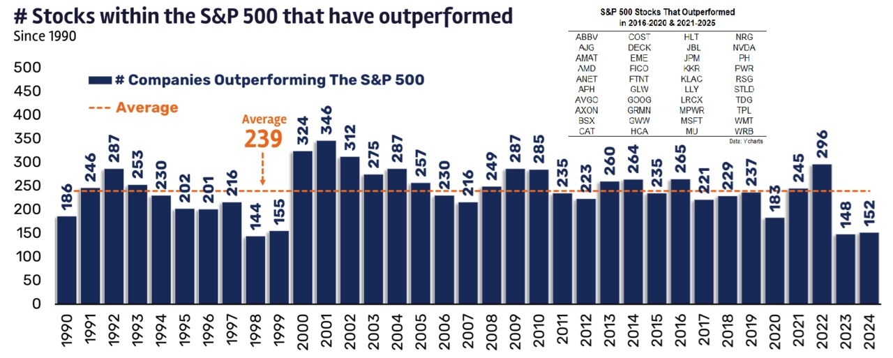 Které akcie jsou ale ty opravdu nejlepší? Vytipovat je předem je minimálně složité, když ne rovnou nemožné. "Jen menší část akcií dokáže překonávat výkon indexu S&P 500 dlouhodobě. Podíval jsem se na období pěti let do roku 2020 a těch následujících, do současnosti. V obou obdobích překonalo trh jenom 40 titulů, mimo jiné Microsoft, Alphabet, NVIDIA, Walmart, JPMorgan nebo Costco Wholesale," upozorňuje Ben Carlson ze společnosti Ritholtz Wealth Management. "V první sledované 'pětiletce' nabídlo nadvýnos 149 titulů, v pěti letech do současnosti pak 241 akcií. Překonat trh v jednom období je těžké, dlouhodobě je to pak skoro nemožné."