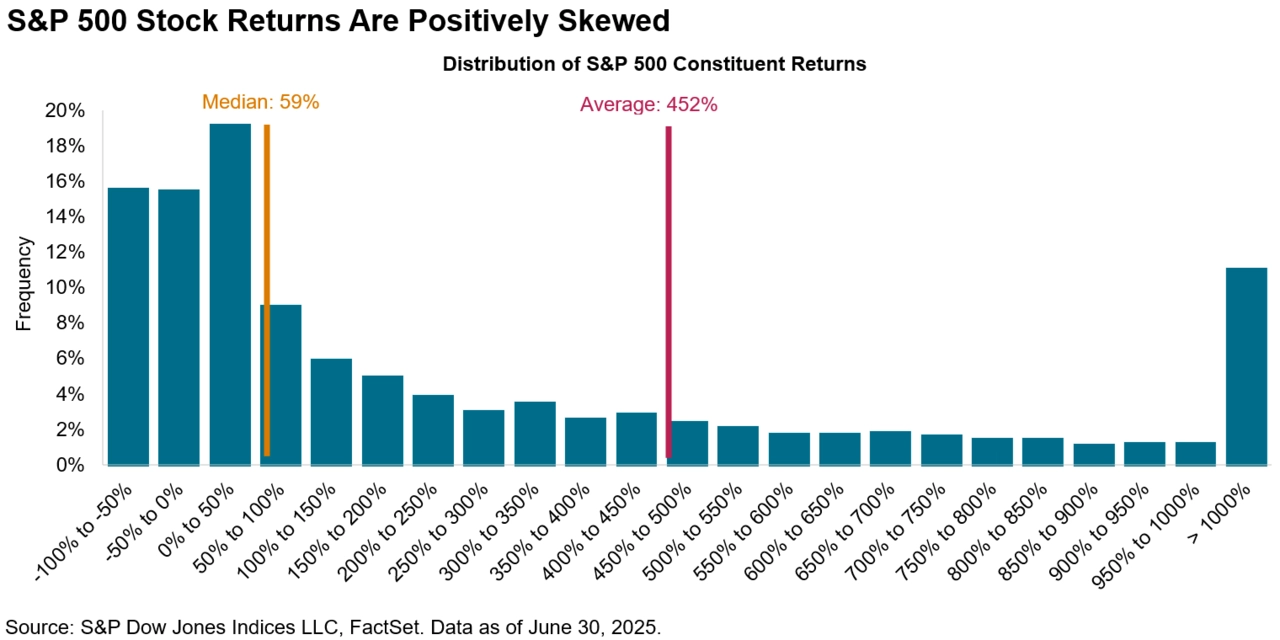 Mediánový výnos akcií v rámci S&P 500 od roku 2001 dosahuje necelých 60 %, ale průměrný výnos je více než 450 %. Jinými slovy, polovina akcií v indexu se za čtvrtstoletí zhodnotila do 60 %, zatímco malá skupina akcií s extrémní výkonností zvedla průměr trhu proti mediánu na více než sedminásobek.
