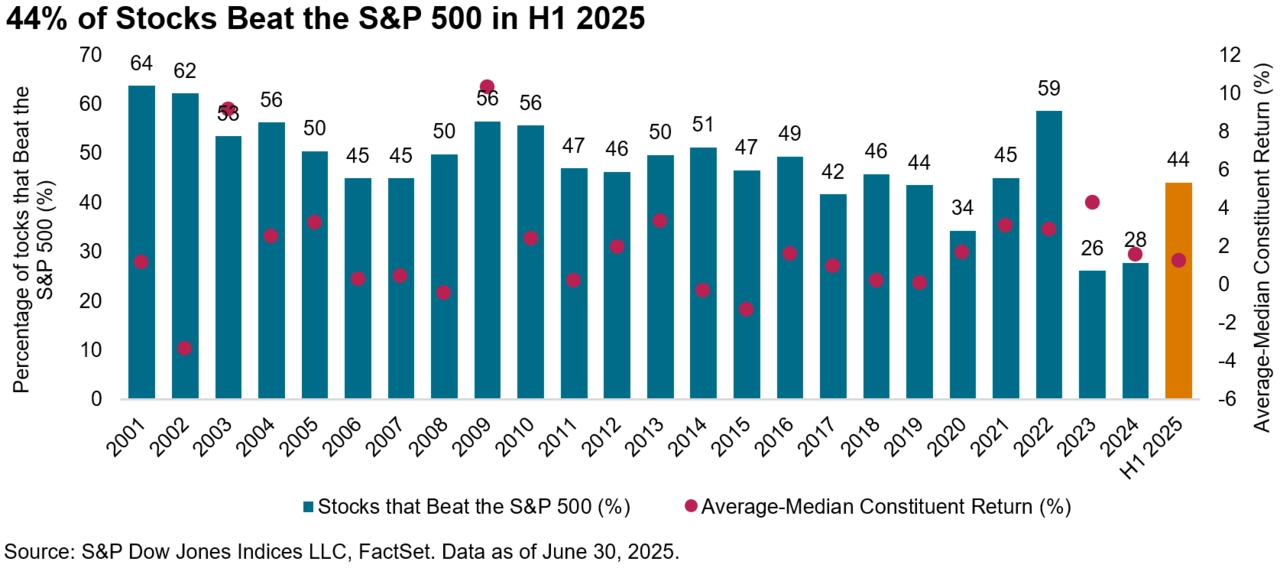 Jedním z klíčových důvodů je fakt, že jen malé množství akcií vykazuje nadprůměrné výnosy. Od začátku roku 2001 do září 2025 dokázalo překonat průměrný výnos indexu S&P 500 jen 19 % akcií z tohoto benchmarku. Jinými slovy, z akcií 500 největších amerických společností na trhu se ani ne pětina zhodnotila výrazněji než index jako celek.