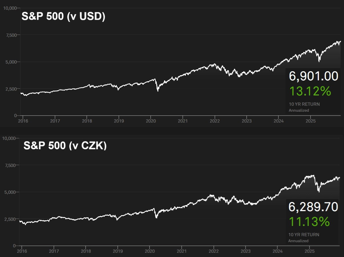 Něco jiného je kurz koruny vůči euru pro českou firmu s velkou částí byznysu třeba v Německu v oboru s relativně nízkými maržemi, něco jiného je stejný kurz pro korunového investora, který s výhledem na desítky let nakupuje akcie SAP nebo Siemensu. Pro něj je měnové riziko neoddělitelnou součástí globálního investování, ale není to nepřítel. Je to jen další z proměnných, které lze buď částečně aktivně řídit, nebo je přijmout jako přirozenou součást cesty k investičním cílům.