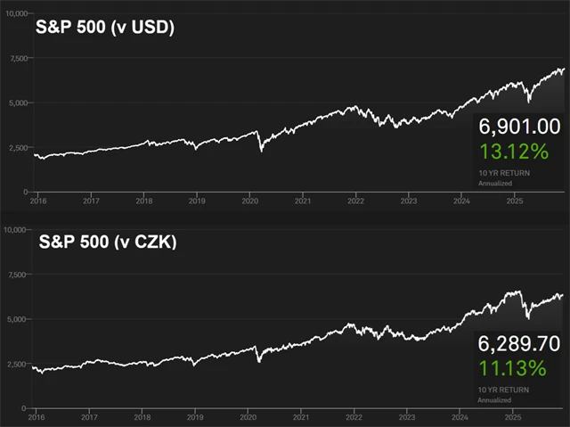 Důvodem je vývoj kurzu české koruny k té či oné konkrétní měně. Pokud vás tedy zajímá posun amerického akciového indexu S&P 500 a konkrétně letos třeba vidíte, že aktuálně vzrostl o zhruba 17 % na nové historické maximum, můžete z toho mít samozřejmě radost. Pokud si ale kupujete nějaký burzovně obchodovaný fond v USA, který tenhle index kopíruje, musíte mít na paměti, co od začátku roku provedla koruna v páru s dolarem. A ouha, kurz USD/CZK letos spadl o 15 %.