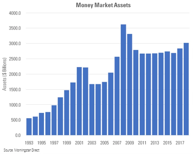 Nejde ale o nic mimořádného, jakkoli by se to mohlo zdát. Objem prostředků ve fondech peněžního trhu narůstal nepřetržitě od roku 1993 do roku 2001. Po většinu tohoto období přitom americké akciové trhy také silně rostly.