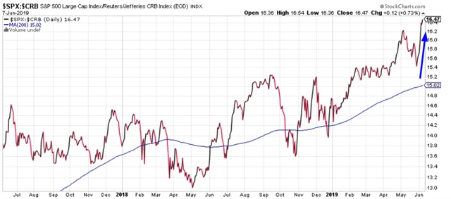 Akcie se zdají být nadhodnocené i ve srovnání s cenami komodit. Poměr cen amerických akcií (indexu S&P 500) k ceně koše komodit byla v první polovině června bezmála 10 % nad 200denním klouzavým průměrem.