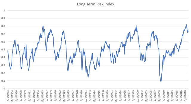 V krátkodobém horizontu mohou americké akcie ještě posílit, ve zhruba ročním výhledu jsou ale naděje na zisky o poznání menší. To ostatně potvrzuje i následující index rizik, který je v podstatě na úrovni z let 1999 a 2007.