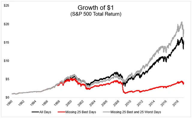 Zajímavé je však i následující srovnání tří hypotetických portfolií. Černá křivka zobrazuje celkovou výkonnost trhu (strategie "kup a drž"), červená křivka zobrazuje výkonnost trhu bez započtení 25 nejlepších dnů a šedá křivka zobrazuje výkonnost trhu bez započtení 25 nejhorších dnů.