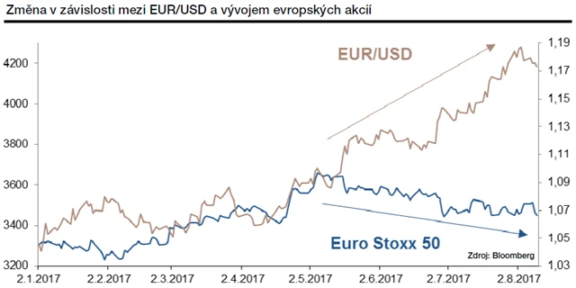 Kurz eura vůči americkému dolaru od začátku letošního roku stoupl z 1,05 na bezmála 1,20. Klasická poučka o oslabujících akciových trzích při posilující domácí měně však pro evropské akcie na začátku letošního roku neplatila. V posledních měsících se ale situace mění.