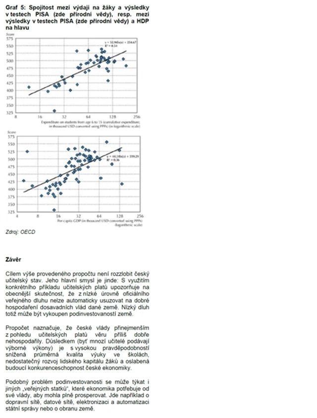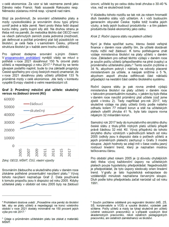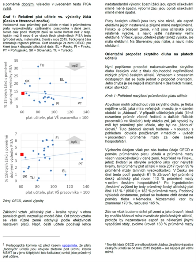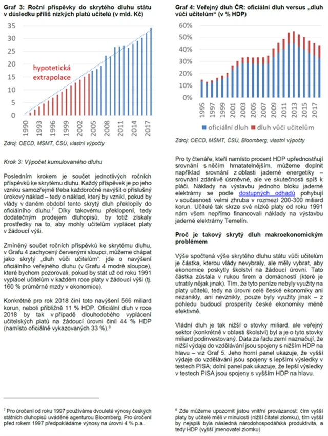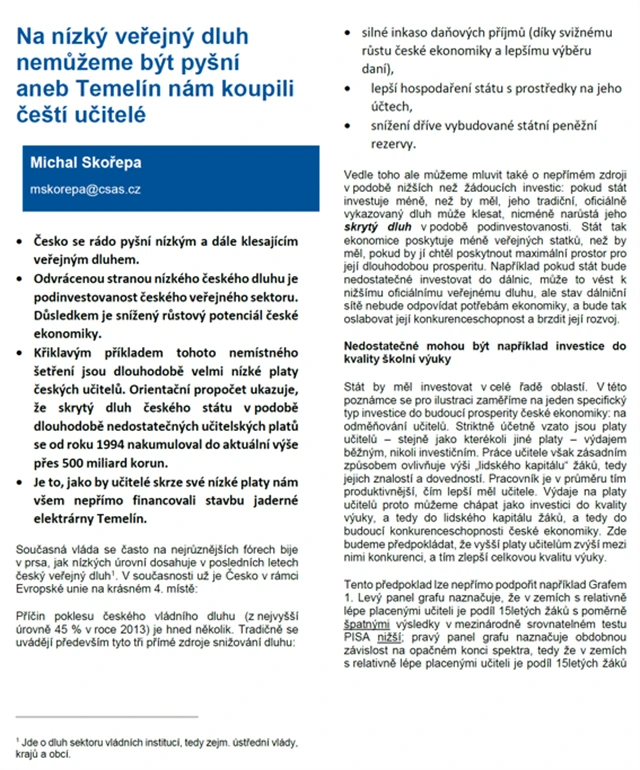 Česko se rádo pyšní nízkým a dále klesajícím veřejným dluhem. Jeho odvrácenou stranou je podinvestovanost veřejného sektoru. Důsledkem toho je snížený růstový potenciál české ekonomiky. Křiklavým příkladem tohoto nemístného šetření jsou dlouhodobě velice nízké platy učitelů. Skrytý dluh státu v podobě dlouhodobě nedostatečných učitelských platů se podle orientačního propočtu od roku 1994 nakumuloval na více než 500 miliard korun. Jako kdyby tedy učitelé skrze své nízké platy zafinancovali stavbu jaderné elektrárny Temelín.