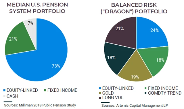 V dračím portfoliu hrají nejvýznamnější roli americké akcie (24% podíl). Dále jsou v něm zastoupeny sázka na volatilitu (21 %), zlato (19 %) a pevně úročená aktiva a komodity (po 18 %).