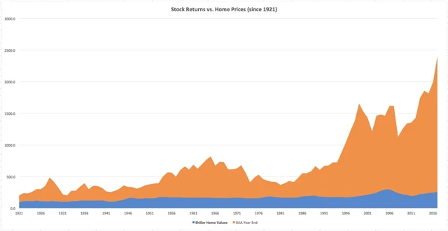 Když srovnáme výkonnost nemovitostí s výkonem amerických akcií zastoupených v indexu Dow Jones Industrial Average, je odpověď na to, zda náhodou není místo splácení hypotéky lepší bydlet v pronájmu a volné prostředky investovat na burze, jednoznačná. Respektive nutí minimálně k zamyšlení se nad tím, zda je nákup nemovitosti opravdu možné považovat za (nejlepší možnou) investici.