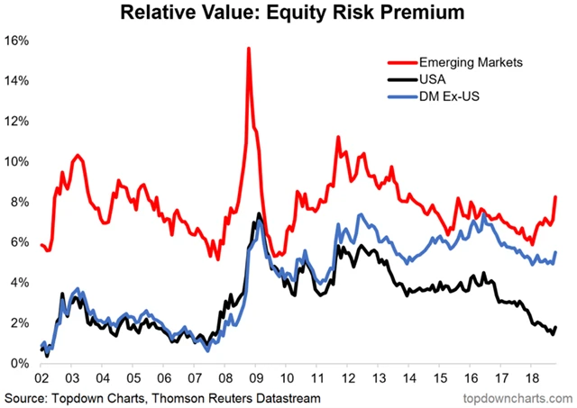 Riziková prémie u akcií z rozvíjejících se trhů v poslední době roste, a to jak v porovnání s americkými akciemi, tak s ostatními trhy. Celkově je riziková prémie na mladých trzích nejvyšší od krize v roce 2008, což tyto trhy dělá atraktivnějšími, zejména v porovnání s americkými tituly, jejichž riziková prémie po devítiletém býčím trendu rychle klesá.