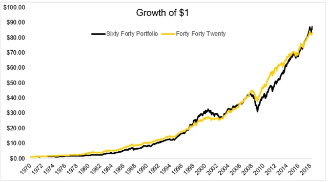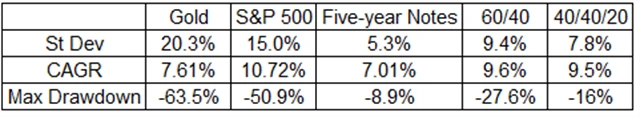 Na dalším grafu je znázorněn výnos z jednoho investovaného dolaru v portfoliu 60/40 (60 % index S&P 500, 40 % pětileté státní dluhopisy USA, rebalancováno na roční bázi) a v portfoliu 40/40/20 (40 % index S&P 500, 40 % pětileté státní dluhopisy USA, 20 % zlato, rebalancováno na roční bázi).