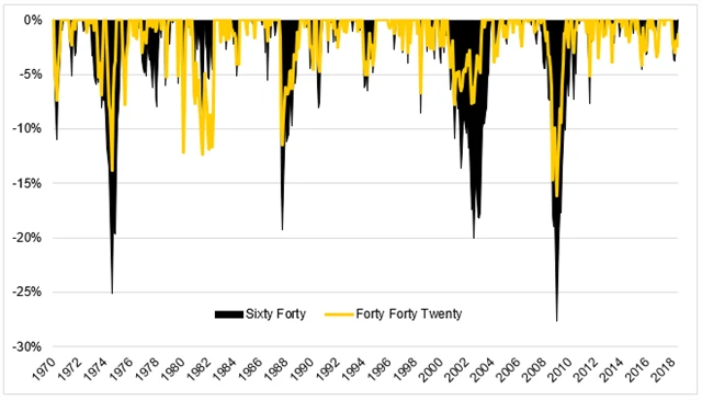 Z tabulky je patrné, že portfolio 40/40/20 má prakticky stejné výnosy (CAGR), ale nižší volatilitu (St Dev) a výrazně nižší maximální propady.