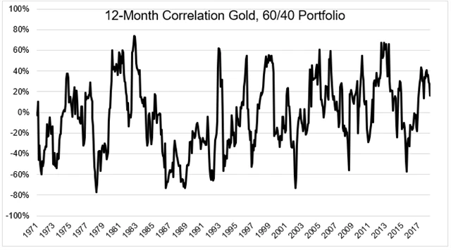 Zlato sice nemá některé pro investory podstatné fundamenty (výnosy, dividendy, cash flow a podobně), jakými disponují akcie, ale i u něj je prakticky nemožné předpokládat, jak se bude jeho cena, zejména v delším horizontu, pohybovat. Právě neexistence fundamentů z něj dělá skvělý nástroj diverzifikace ve vztahu k akciím a dluhopisům. Patrné je to i klouzavé 12měsíční korelace ceny zlata a hodnoty portfolia 60/40.