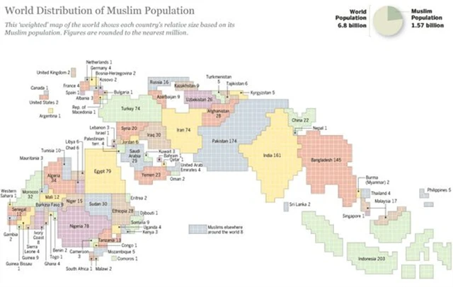 Stejná studie uvádí, že zhruba 300 milionů muslimů (jedna pětina) žije v zemích, kde není islám nejrozšířenějším náboženstvím. Muslimskou populaci v jednotlivých zemích porovnává následující obrázek.
