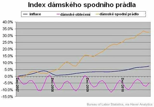 Na Investičním webu jste se mohli přesvědčit o tom, že existuje celá řada podivných ekonomických indikátorů. Patří mezi ně i index sexy servírek nebo index mužského spodního prádla. Ten si zamiloval dokonce i bývalý šéf Fedu Alan Greenspan. Teď vám nabízíme další, ještě ne příliš známý index - index ženského spodního prádla. Ten totiž vyvrací "povídačky" o pánských trenkách.
