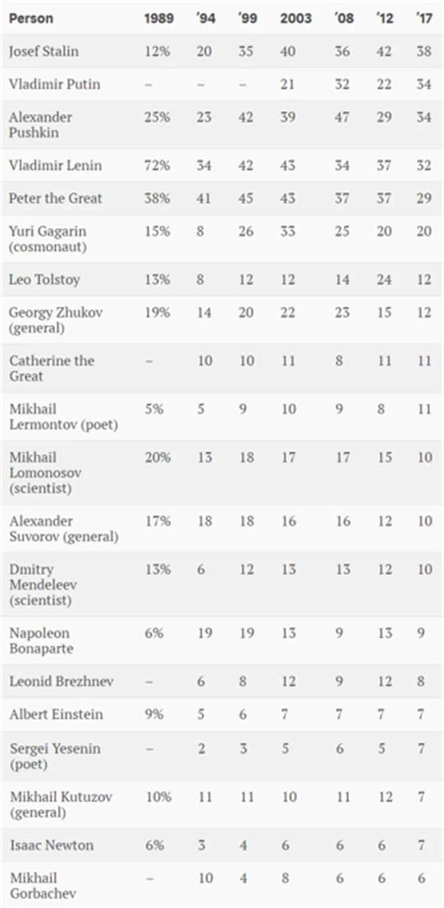 Žebříček je sestaven na základě průzkumů Levadova střediska o tom, kdo je největší postavou světové historie. Čísla vyjadřují procentní podíl respondentů, kteří v daném roce uvedli dotyčnou osobu na prvním místě.