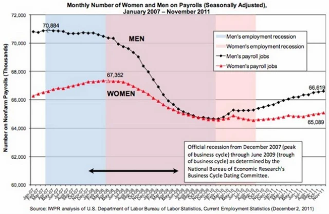 Graf z dílny Institutu pro výzkum politiky žen (Institute for Women's Policy Research) ukazuje rozdíl mezi přírůstky počtu pracovních míst mužů a žen v době, kdy se ekonomika odrazila ode dna. Data jsou z amerického ministerstva práce.