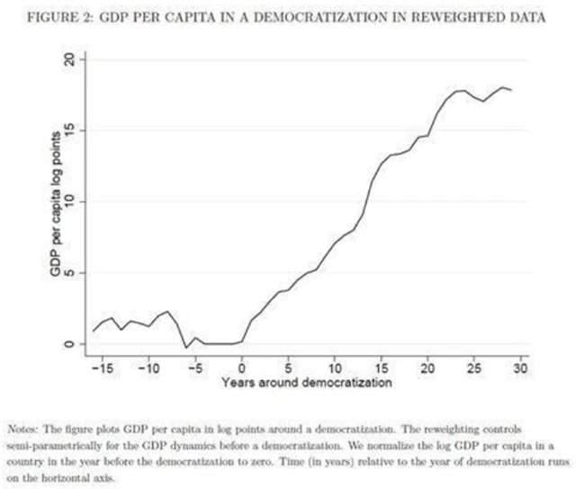 Ekonomové také ukázali, že je nesmysl tvrdit, že demokracie má pozitivní dopady až od určité úrovně HDP. Jinými slovy, diktátorství nelze ospravedlnit potřebou rychle dohnat vyspělé ekonomiky. Je to nesmysl, kterým se pouze diktátoři mají tendenci ohánět. Ekonomika dlouhodobě prosperuje jen tehdy, když stát slouží lidem, ne naopak.