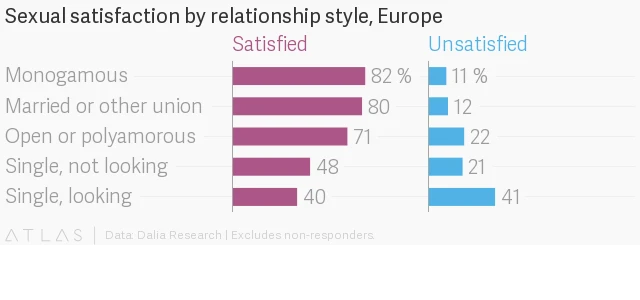 Jsou na tom lépe než nezadaní, kteří sex nevyhledávají (celkem pochopitelně), i než nezadaní, kteří jej vyhledávají (kytky a večeře se prodraží). Jsou spokojenější než ti, kteří žijí v "otevřených" či polyamorických vztazích, a dokonce i než ti, kteří žijí v manželství (patrně ovšem jinak než monogamně, protože k čemu by takové rozdělení jinak bylo, že ano).