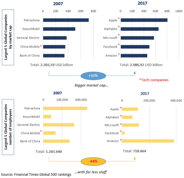 Na vrcholu žebříčku největších firem podle tržní kapitalizace jsou nyní Apple, Alphabet, Microsoft, Facebook a Amazon. Na tom by nebylo samo o sobě nic tak zajímavého. Nový rozměr obměna seznamu dostává ve chvíli, kdy se zaměříme na počet zaměstnanců firemních gigantů dnes a před deseti lety.