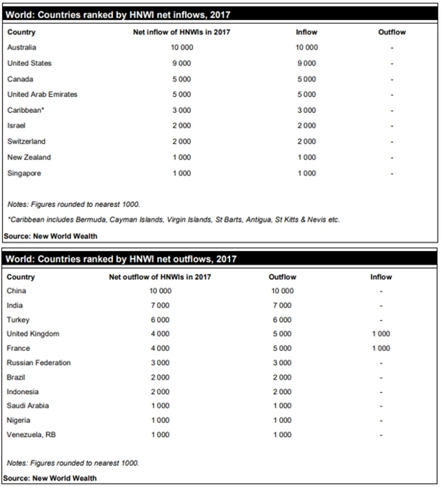 Výrazný příliv boháčů zaznamenaly Austrálie, Kanada či Spojené arabské emiráty, tedy politicky stabilní země. Do Austrálie loni přišlo přibližně 10 000 milionářů a do Kanady a Spojených arabských emirátů jich zamířilo v obou případech kolem 5 000.