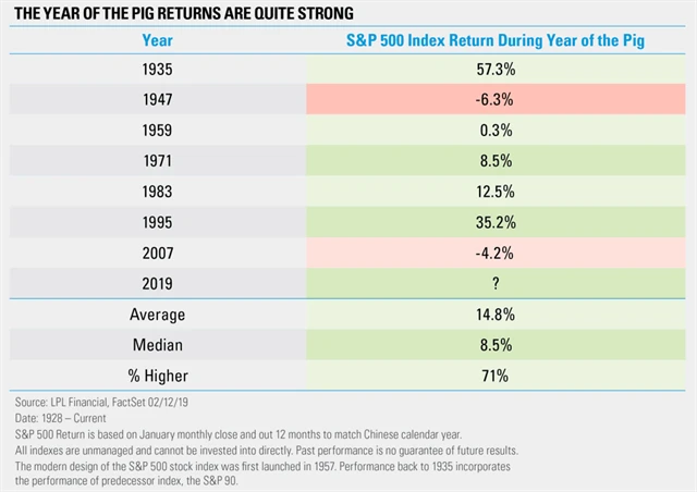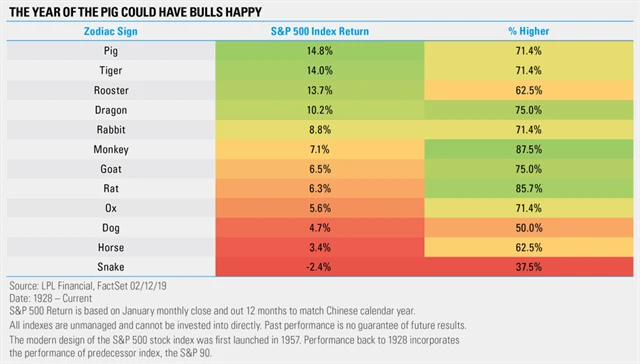 "Prase je jedním z 12 zvířecích symbolů čínského zvěrokruhu a v čínské kultuře je považováno za symbol bohatství. Pro nás je to zajímavé i proto, že v letech prasete zaznamenávaly akcie v minulosti solidní výkonnost. Žádné z 12 znamení zvěrokruhu nevykázalo lepší průměrný výnos," vysvětluje Ryan Detrick, analytik z LPL Financial.