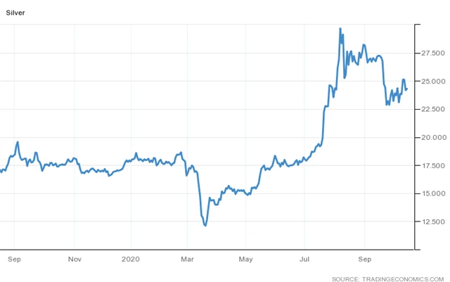 Stříbro není tak vyhledávaným bezpečným přístavem jako zlato, poptávka po něm jako uchovateli hodnoty ale v dobách nejistoty také roste. Jeho využití je ovšem zejména průmyslové. Do karet navíc stříbru může hrát jeho relativní podhodnocení ve srovnání se zlatem. Poměr cen obou kovů je z historického hlediska stále nízký. Na cenu stříbra jinak budou působit podobné faktory jako na cenu zlata. Do konce roku se tak cena stříbra může opět stabilně pohybovat nad 25 USD za trojskou unci.