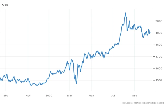 Zlato je letos jedním z nejvýkonnějších na trhu obchodovaných instrumentů a v eurech, korunách i dolarech navýšilo historická maxima. Po překotném růstu nad 2 000 USD došlo k mírné korekci a stabilizaci ceny zhruba mezi 1 900 a 2 000 USD za unci.