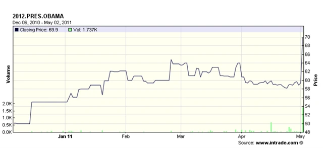 Vývoj preferencí na znovuzvolení amerického prezidenta Baracka Obamy v druhém funkčním období nabral po oznámení zabití nejhledanějšího teroristy Usámy bin Ládina raketový směr vzhůru. Alespoň podle vývoje na grafu webového portálu Intrade.com, kde si na podobné události můžete zaspekulovat podobně jako s akciemi.