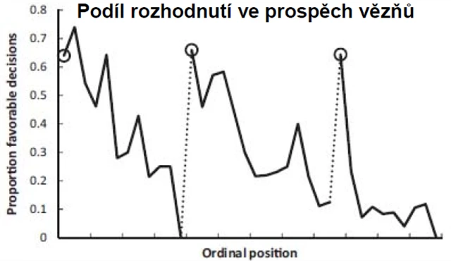 Studie ukázala, že po přestávce se pravděpodobnost rozhodnutí o podmínečném propuštění pohybovala kolem 65 procent**. Nicméně pak postupně klesala, a to až téměř k nule před další přestávkou.