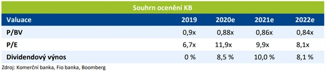 Akcie Komerční banky se aktuálně obchodují s poměrem ceny k účetní hodnotě (P/BV) na úrovni 0,88 a ukazatelem P/E 11,9 (podle odhadů Fio banky pro rok 2020). Vůči historickým průměrným valuačním násobkům za poslední tři roky (P/E 13,1, P/BV 1,6) se tak titul obchoduje s výrazným diskontem.
