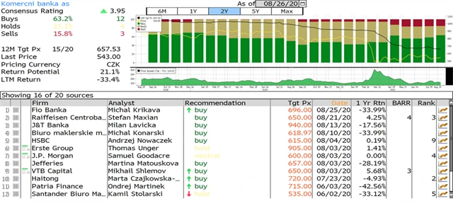 Pandemie nemoci covid-19 tvrdě zasáhla mimo jiné banky. Slabé hospodářské výsledky finančních domů odrážejí i aktualizovaná investiční doporučení. Analytik Michal Křikava z Fio banky snížil cílovou cenu akcií Komerční banky na 696 Kč z 903 Kč s hodnocením na stupni "kupovat".