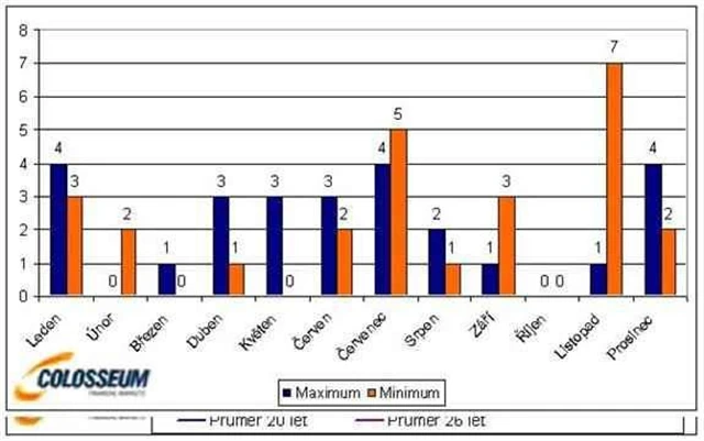 Obrázek 3: Množství ročních maxim a minim v jednotlivých měsících za 26 let (Zdroj: CSI, Colosseum)