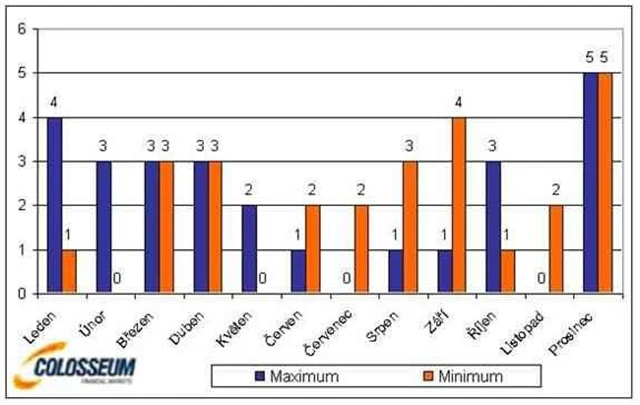 Obrázek 3: Množství ročních maxim a minim v jednotlivých měsících za 26 let – Data upravená o efekt rolování (Zdroj: CSI, Colosseum)